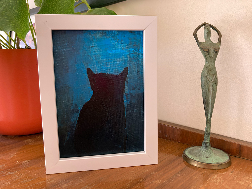 ‘Black cat – Max on blue’. Painting cats are my reset, this is my cat Max painted in a more kitteny way. Someone asked why I don’t paint the front – I guess I’m just used to seeing the back of my cat unless its feeding time – she’s the outdoorsy type. If cats went clubbing – you’d find her in Ibiza!