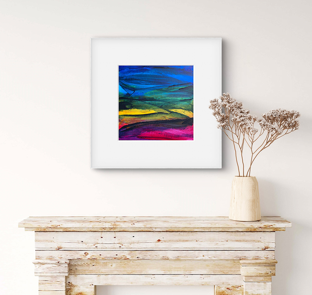 Gloaming is another painting like Dusk (same meaning!) inspired by a rather fabulous late summer evening sky on a drive home. I couldn’t stop to take a picture as I was on the motorway so had to commit to memory the changing colours as the night drew in – so this is my recollection of the span of colours as it was changing so quickly.