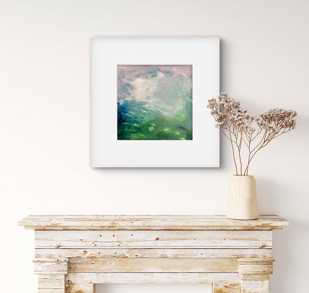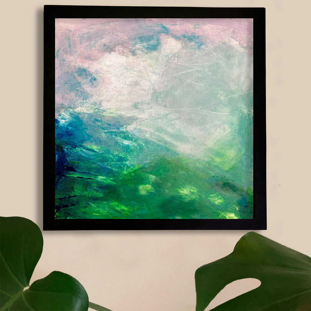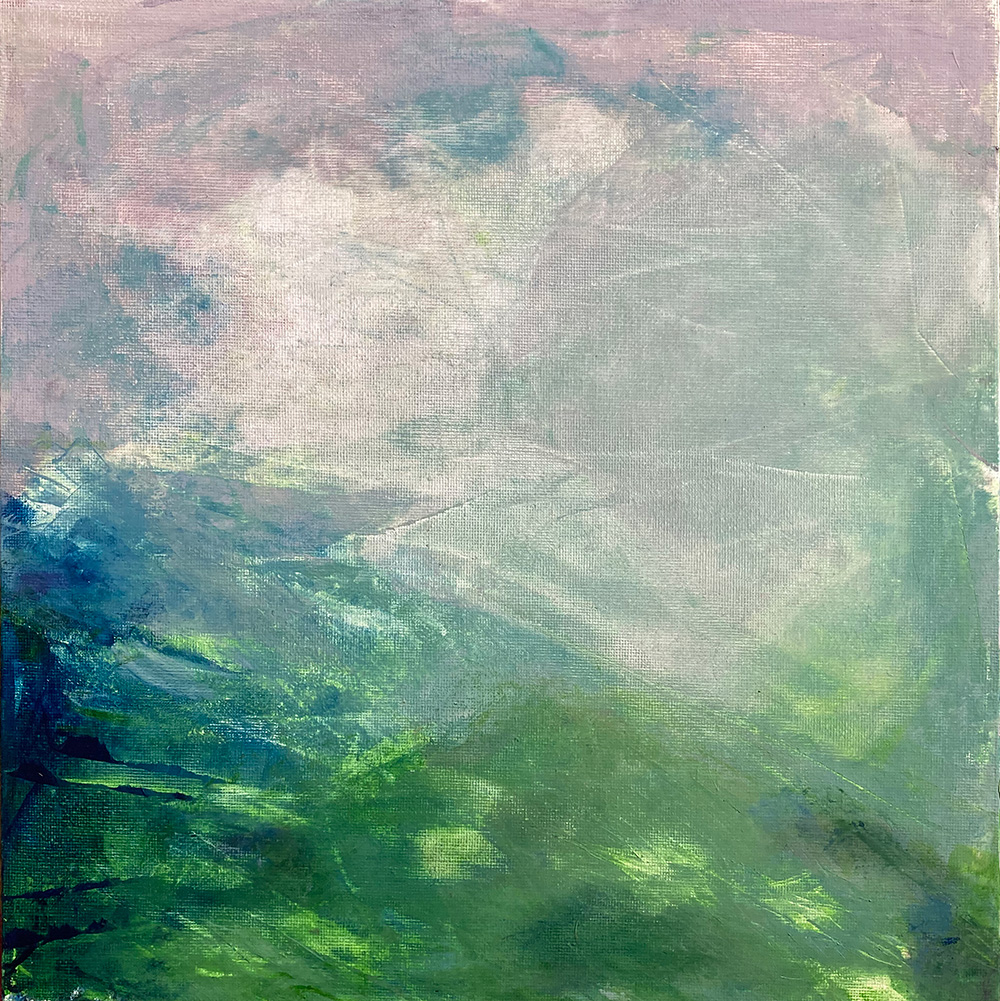 Peeking – I wanted to capture the sun light burning through breaks in a hazy pink dawn sky, creating spots of light on a green land. The scene is indistinct and colours are softer and greens become blues. Colours cutting back to the white of the canvas, revealing its texture.