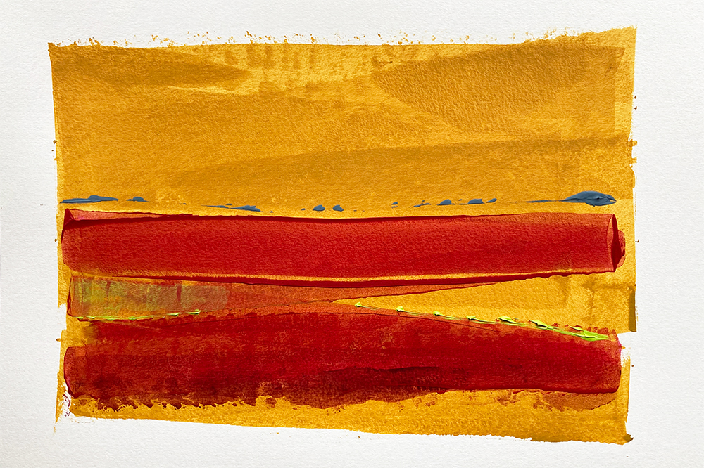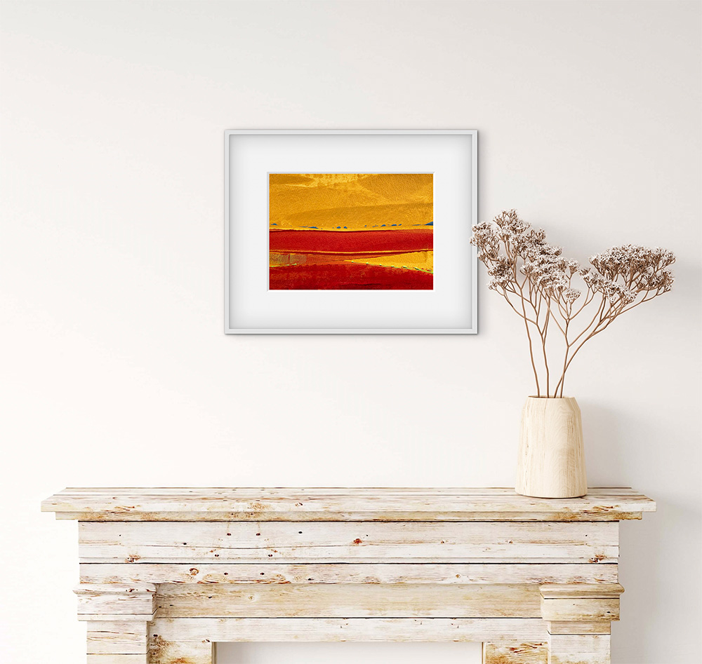 Red field – a painting on paper. Working on paper is where my mojo gets fed and where I am most free. The page first has a loosely painted coat of Gesso and left to dry before painting. This adds a slightly mellow creamy white base note to the painting and it’s loose edges add to the energy of the painting (see pic).