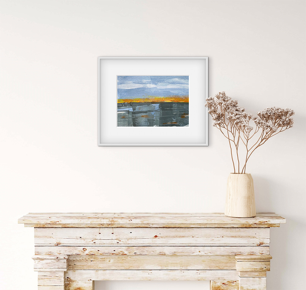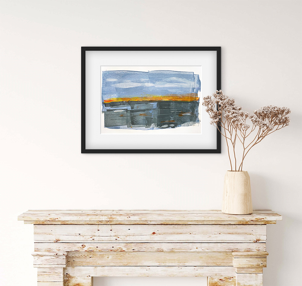 Reflect – a painting from the sketchbook. The sketchbook is where my mojo gets fed and where I am most free. The page first has a loosely painted coat of Gesso and left to dry before painting. This adds a slightly mellow creamy white base note to the painting and it’s loose edges add to the energy of the painting (see pic).